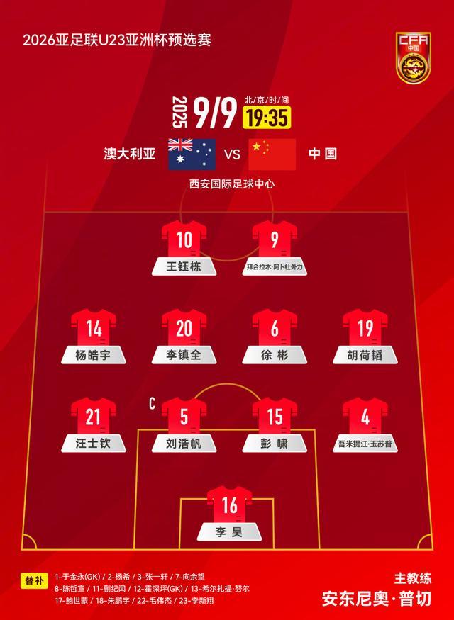 北京时间9月9日19点35分,2026亚足联U23亚洲杯预选赛D组第3轮,西安国际足球中心,中国U23对阵澳大利亚U23。