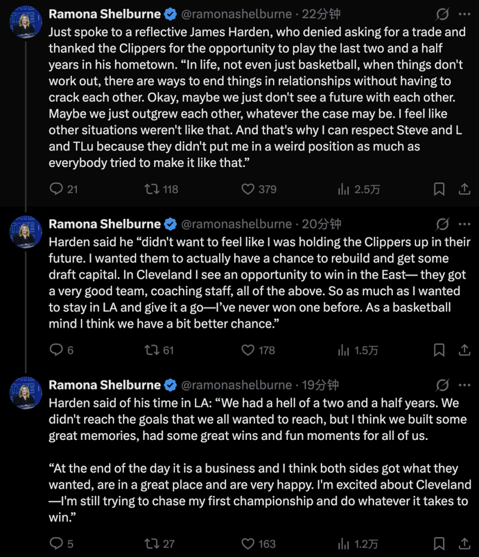 据ESPN记者Ramon Shelburne报道,他与哈登进行私下谈话,哈登否认自己要求交易,并感谢快船给他过去两年半在家乡打球的机会。