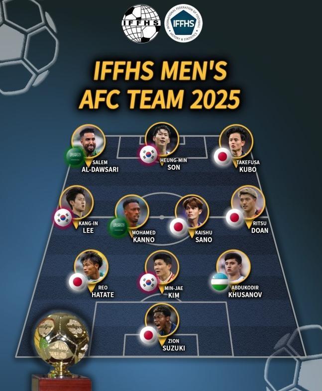 国际足球历史联合统计会不久前公布了2025年的亚足联年度最佳阵容,亚洲排名第一的日本队成为了最大赢家,他们足足有5人入选,几乎占据了半壁江山。韩国队则有3人入围,沙特队和乌兹别克斯坦队,瓜分了剩余的3个名额,中国队依旧无人上榜。