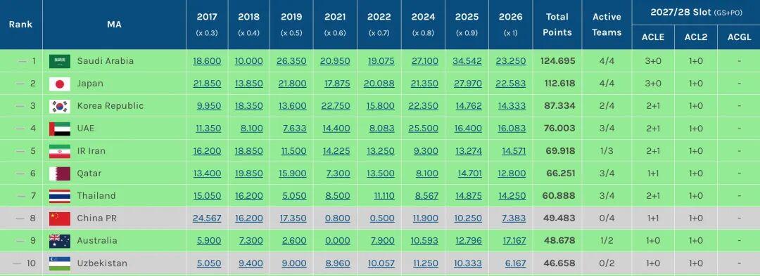 0.3分优势!中超力压澳超保住3个亚冠席位 目前位列东亚区第4